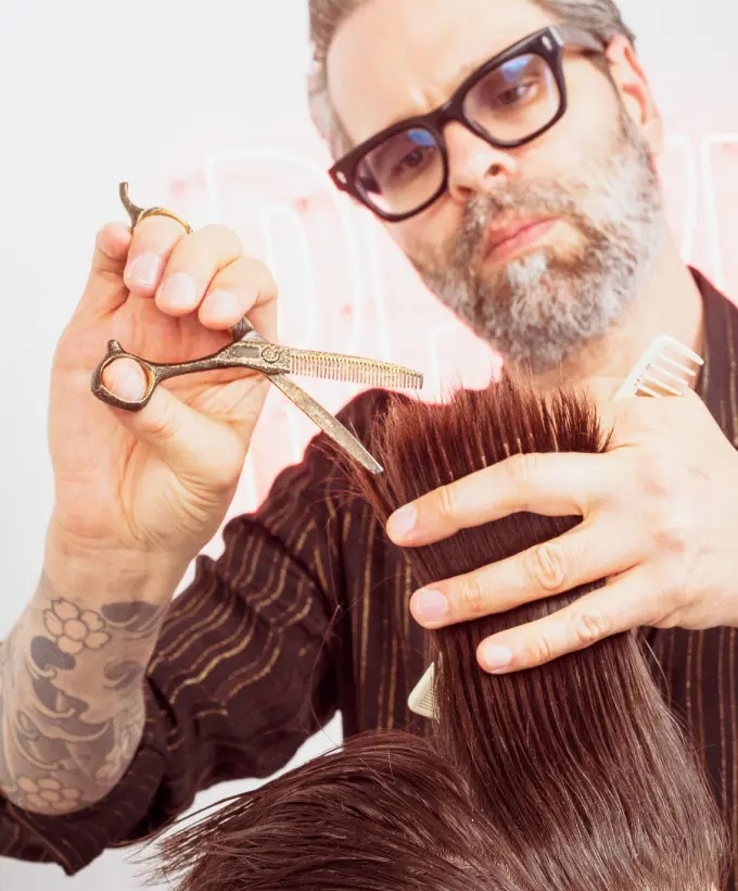 including Leen himself, who wanted a thinning added.By cutting one-third of the ends of hair with the reverse-bladed thinning scissors that gives softer texture on hair. This also makes it easier for pomade to blend in and the hairstyle to last longer.