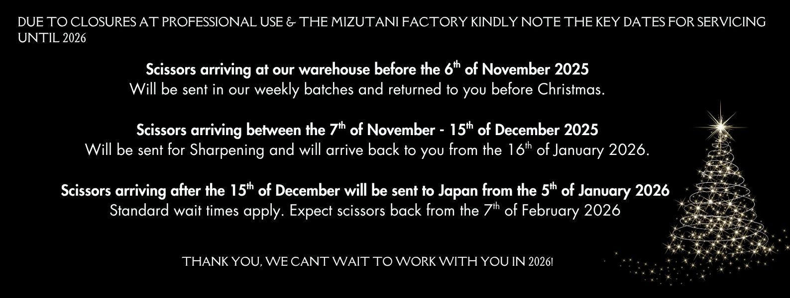 Rust removal and polishing takes around 6-8 weeks to perfect, doesnt include transit times to and from Japan and back to you. We recommend having your scissors sharpened during this time to avoid having more time without your scissors in the near future,